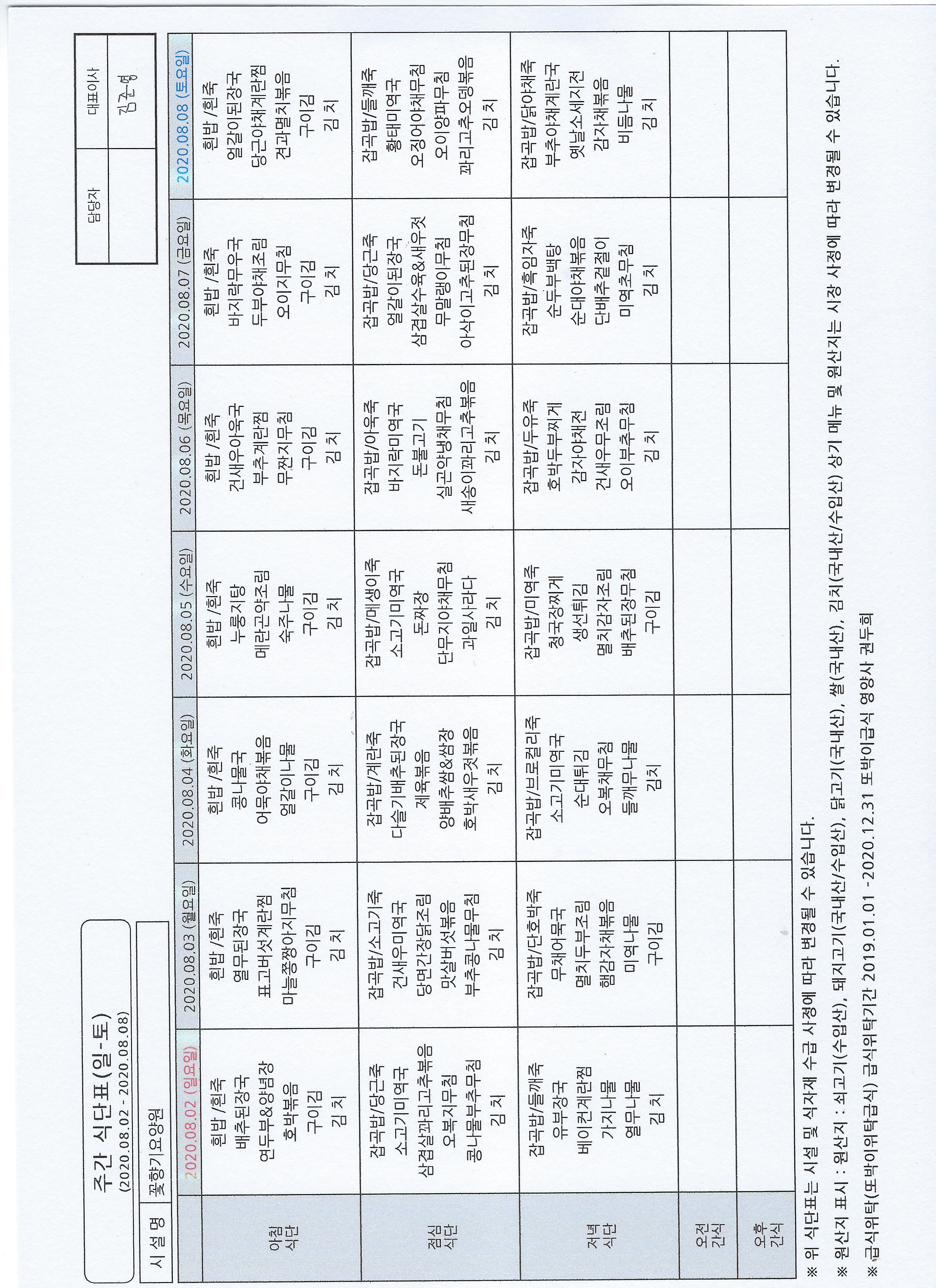 2020년 8월 1주 식단표