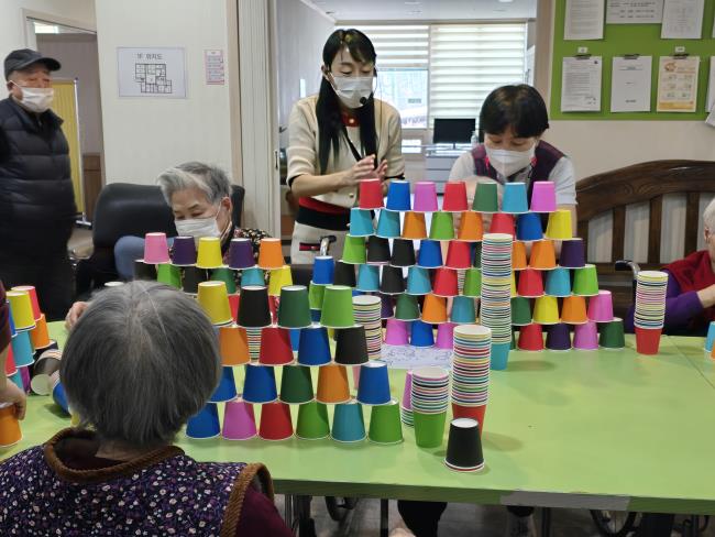 컵을 가지고 색을 기억하는 활동과 음악에 맞춰 성처럼 높이 쌓아보는 활동을 통해